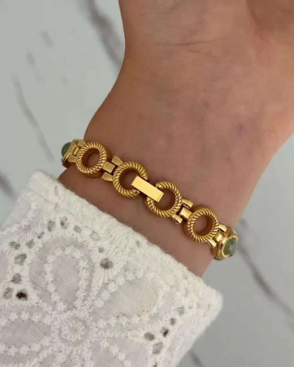 Dodaj odrobinę ponadczasowej elegancji do swojego looku z pozłacanym zegarkiem vintage Cettina. Ten subtelny czasomierz wyróżnia się delikatną, owalną tarczą w ramce z wyrafinowanego, złotego pierścienia, emanując klasycznym urokiem. Zielone akcenty z kamieni dodają mu unikalnego, luksusowego charakteru, czyniąc go wyjątkowym dodatkiem w stylu retro.
